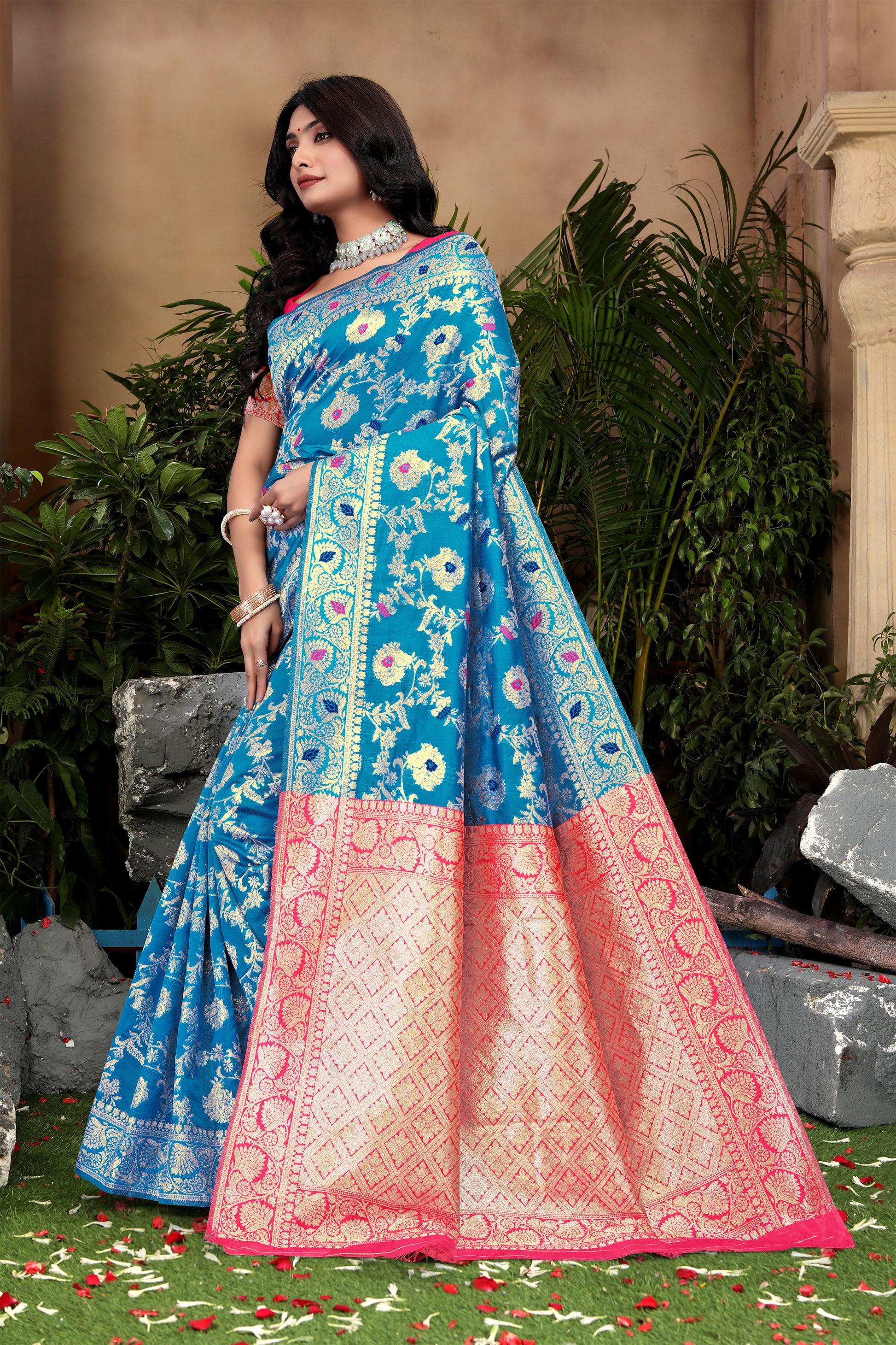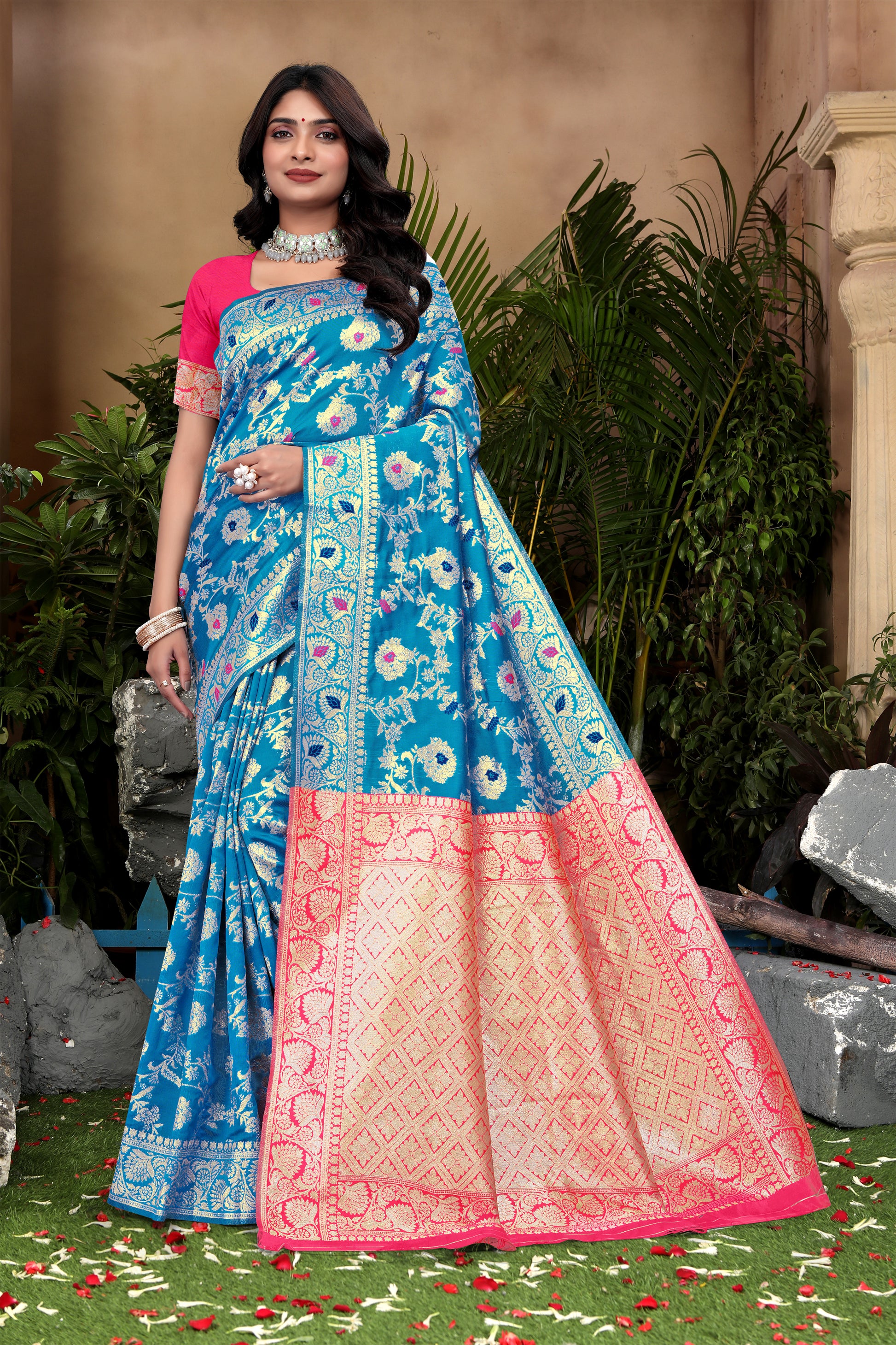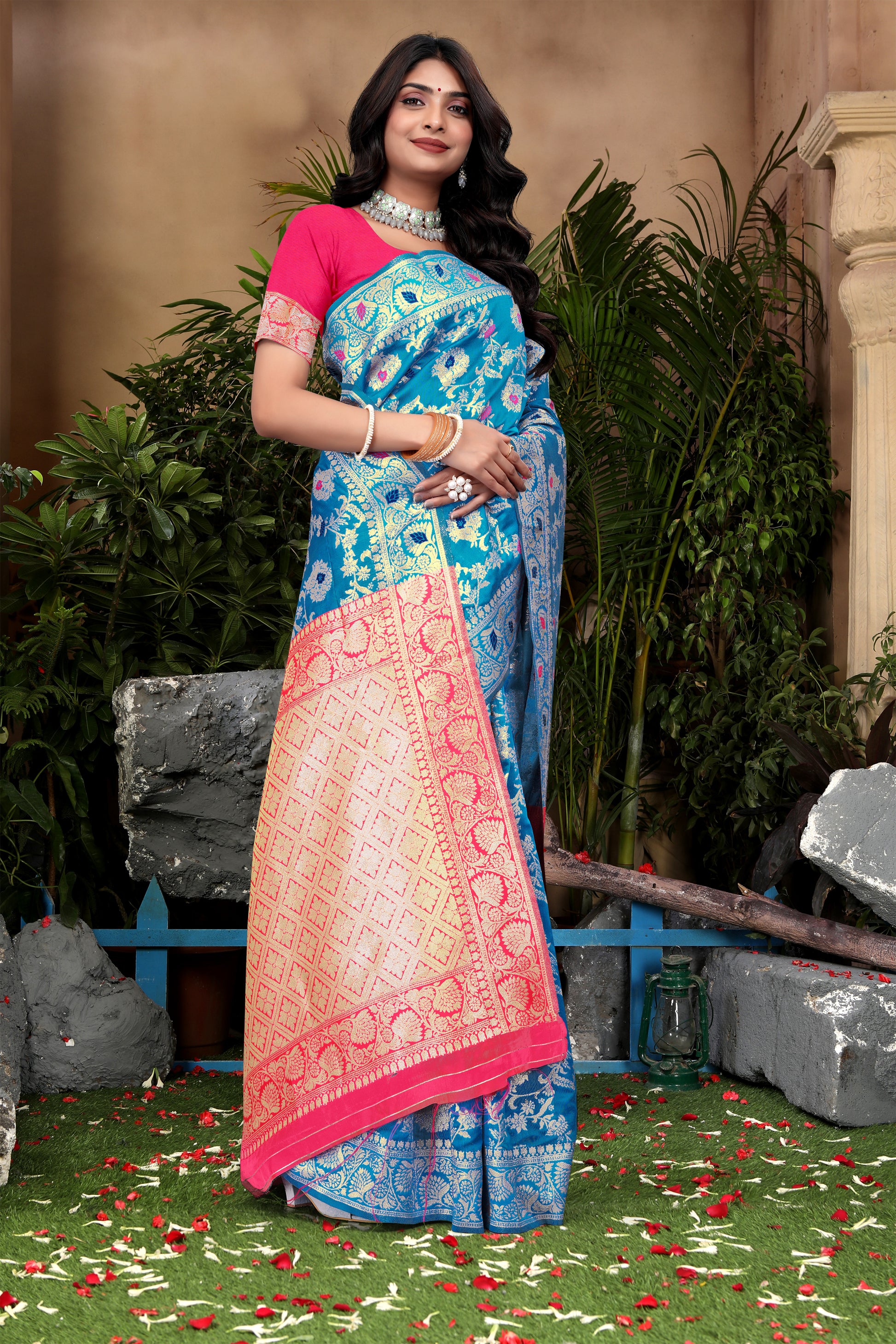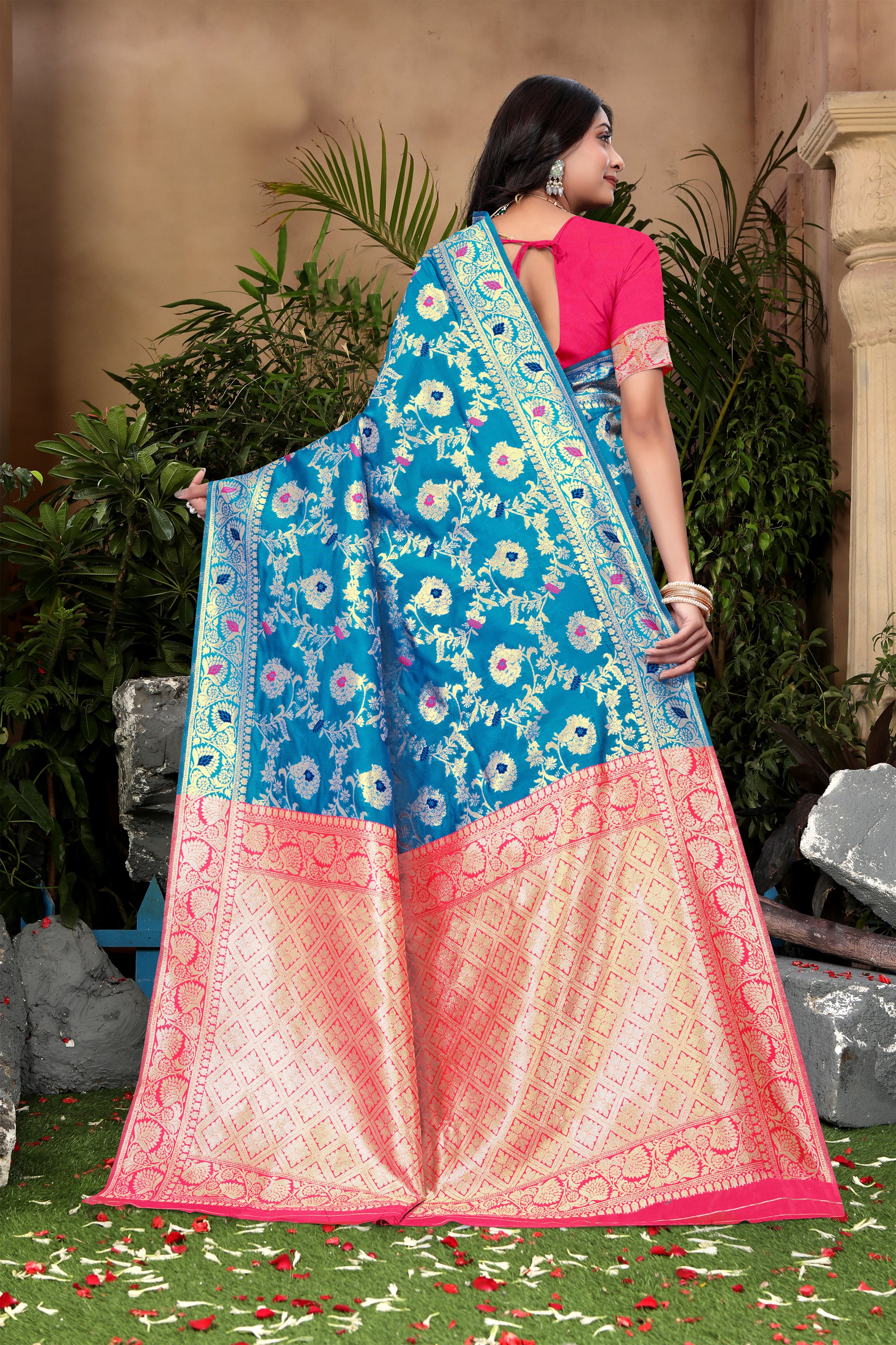Cerulean Blue Banarasi Silk Saree with Pink Zari Weaving