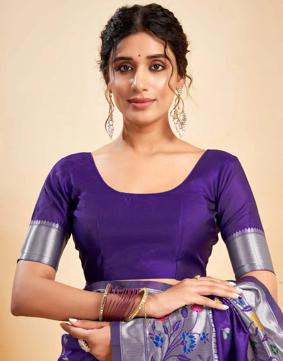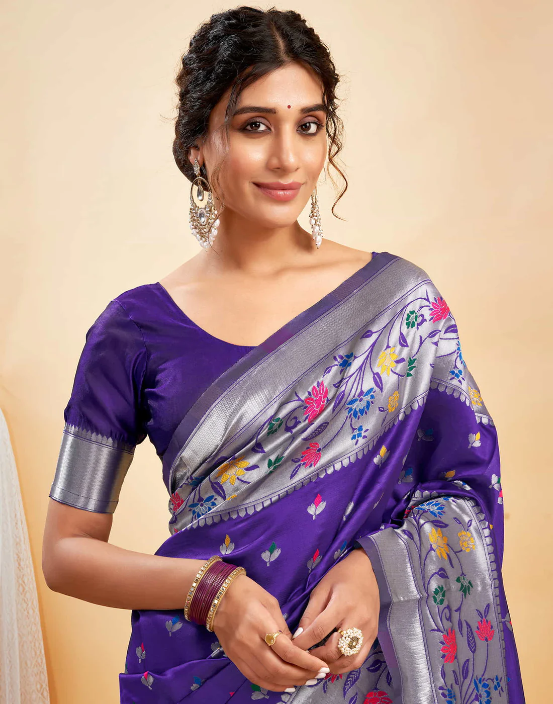 This saree is more than just an outfit; it's a testament to timeless beauty and artisanal skill. The luxurious violet hue paired with the intricate zari and thread work creates a captivating look that will make you feel confident and elegant. It's a statement piece that seamlessly blends traditional charm with a touch of modern grace, ensuring you stand out at any event.