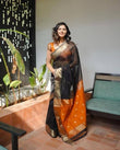 This effortlessly elegant black chiffon saree is a perfect blend of modern chic and classic tradition. The lightweight and sheer fabric drapes beautifully, while the golden zari weaving on the border and pallu adds a touch of subtle shimmer and sophistication. Paired with a contrasting orange-gold blouse, this saree makes a bold and stylish statement. It is a versatile piece that is ideal for evening events, cocktail parties, and festive gatherings.