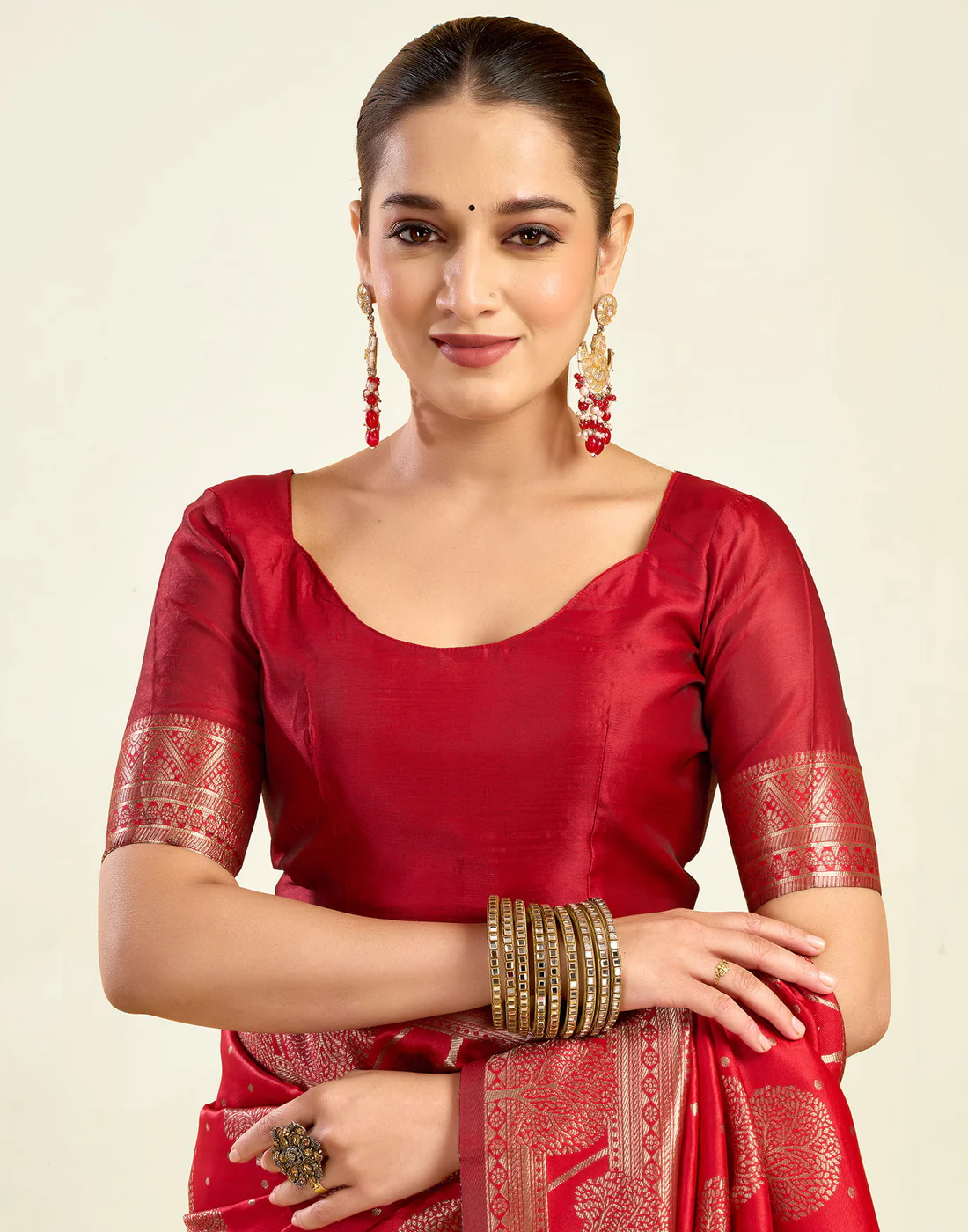 Blouse Piece: Included (Unstitched, matching red with zari border)