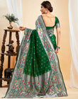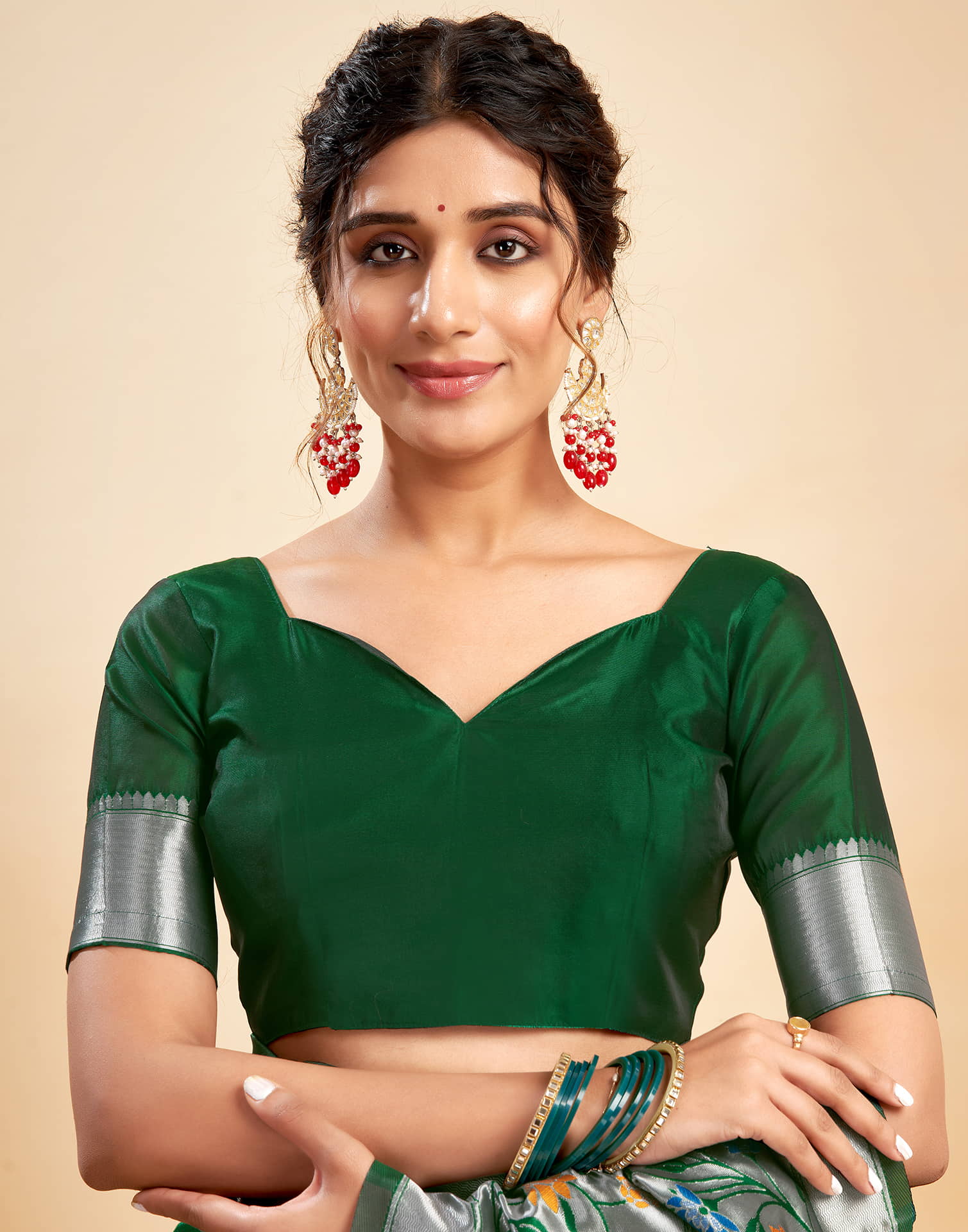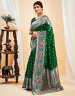 This saree is more than just an outfit; it's a testament to timeless beauty and artisanal skill. The luxurious bottle green hue paired with the intricate zari and thread work creates a captivating look that will make you feel confident and elegant. It's a statement piece that seamlessly blends traditional charm with a touch of modern grace, ensuring you stand out at any event.