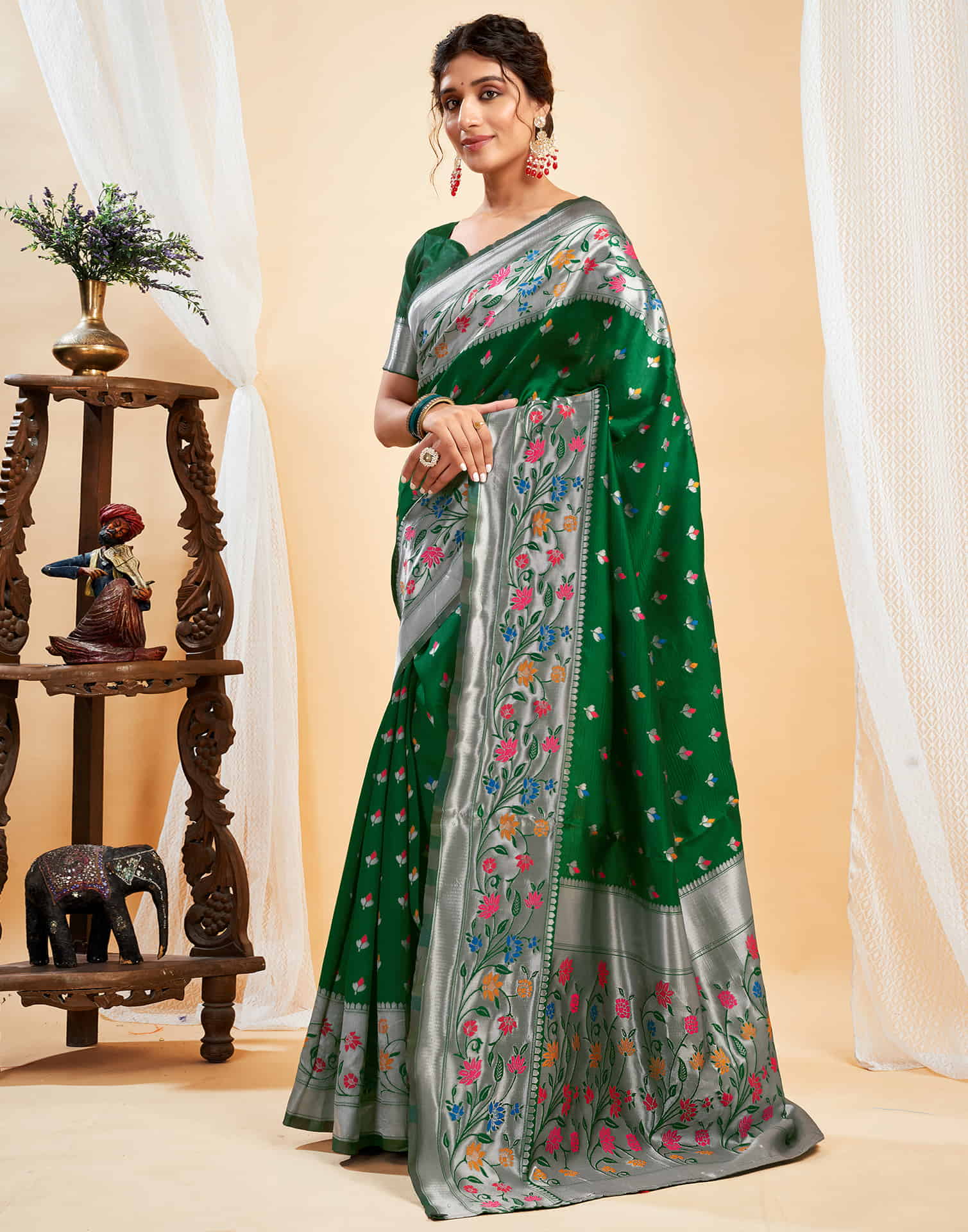 This elegant Bottle Green Banarasi Silk Saree is a true masterpiece of traditional weaving. The deep green hue is brought to life with delicate zari weaving, featuring small, scattered butta motifs that add a subtle sparkle. The broad, elegant border and grand pallu are a work of art, with a stunning mix of floral and paisley designs in colorful threads and shimmering zari. This saree is a perfect blend of timeless tradition and artistic flair, making it an ideal choice for festive celebrations, weddings, and special occasions.