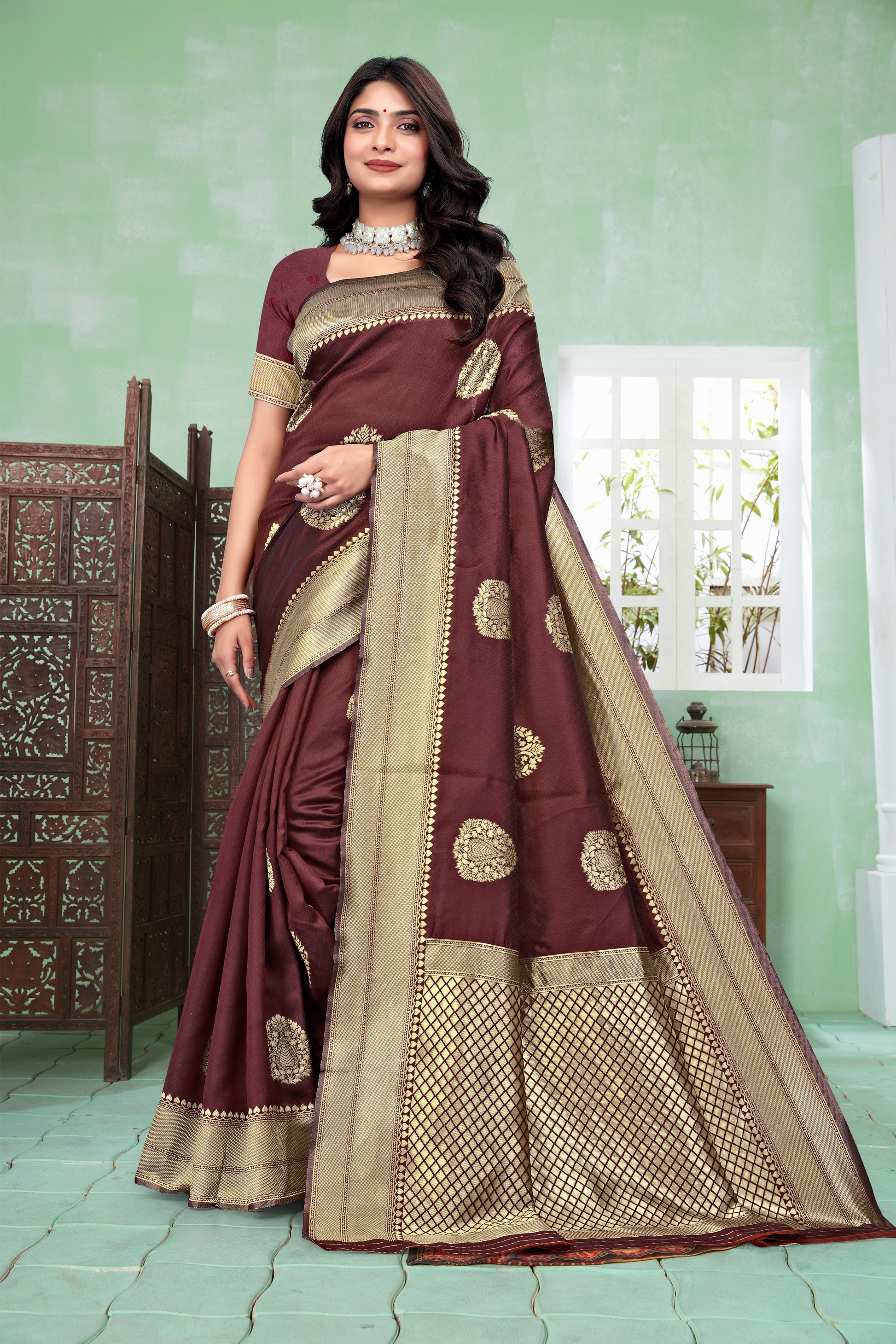 The classic maroon and gold combination is a timeless favorite, making this saree a must-have for any traditional wardrobe. The rich weaving and luxurious feel will make you feel confident and graceful at any event, blending traditional elegance with a radiant appeal.