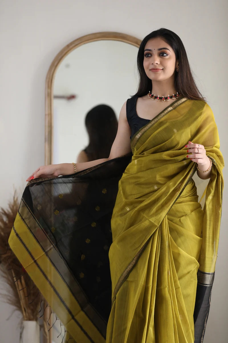 Step into timeless elegance with this captivating olive green handloom saree. The body features a rich, earthy tone that is beautifully complemented by a contrasting black pallu and border. The black section is adorned with a delicate golden zari border and small, intricate motifs, creating a striking and sophisticated look. This saree is lightweight and comfortable, making it a perfect choice for formal dinners, festive occasions, or cultural events. It’s a versatile piece that combines classic style with a modern sensibility.