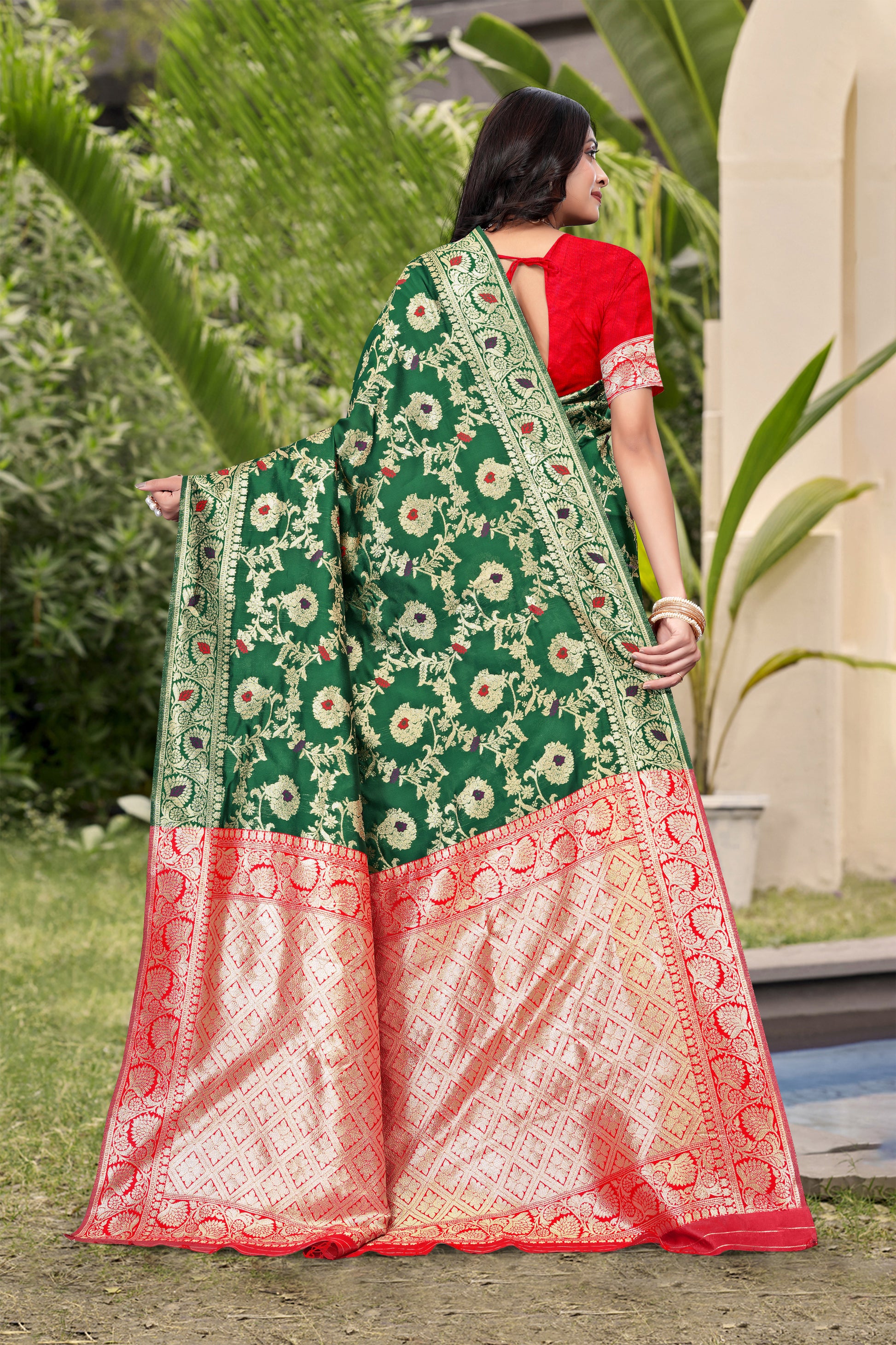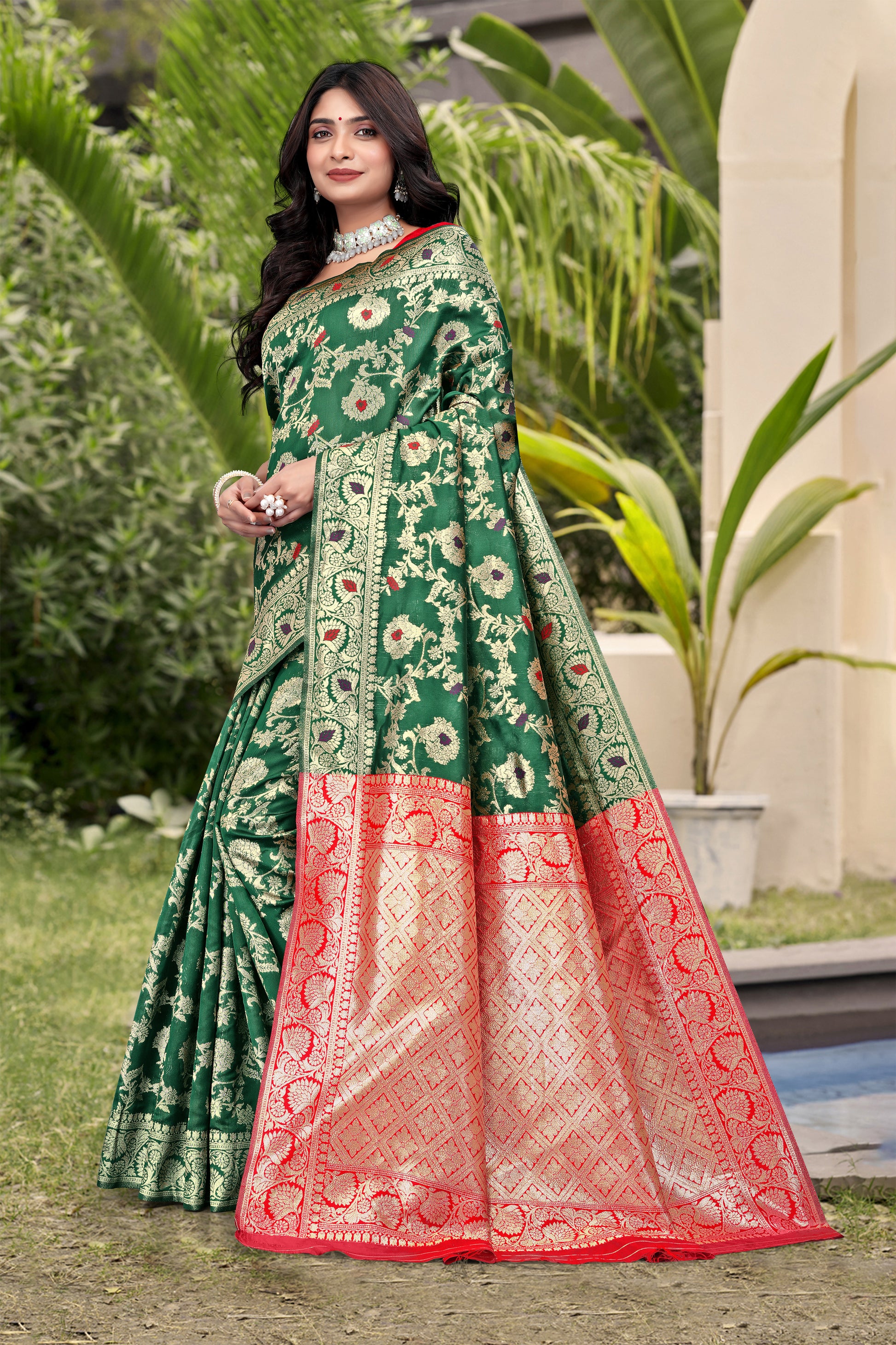Emerald Green Banarasi Silk Saree with Red Zari Weaving
