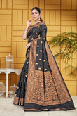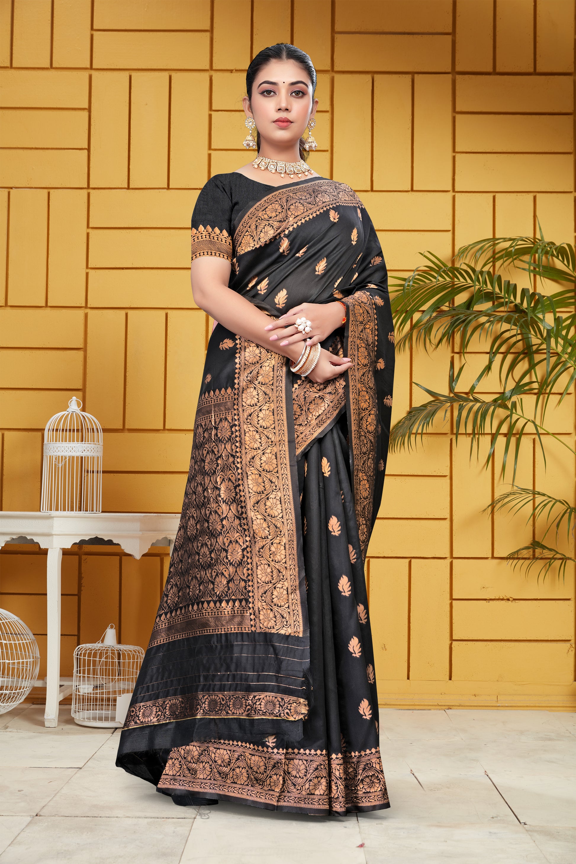 The classic black and bronze combination offers a bold yet timeless appeal. The luxurious feel and detailed weaving make this saree a perfect addition to your ethnic collection, offering a graceful and regal look for any special occasion.