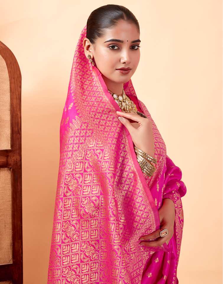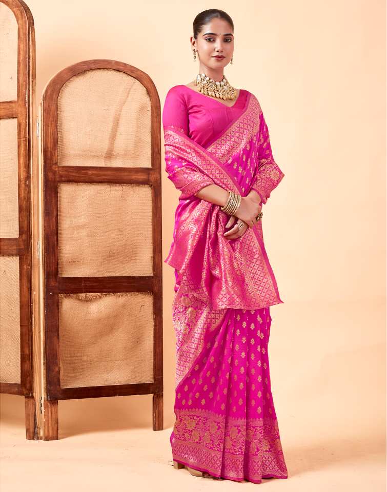 This saree is more than just an outfit; it's a testament to timeless beauty and artisanal skill. The luxurious rani pink hue paired with the intricate golden zari work creates a captivating look that will make you feel confident and elegant. It's a statement piece that seamlessly blends traditional charm with a touch of modern grace, ensuring you stand out at any event.