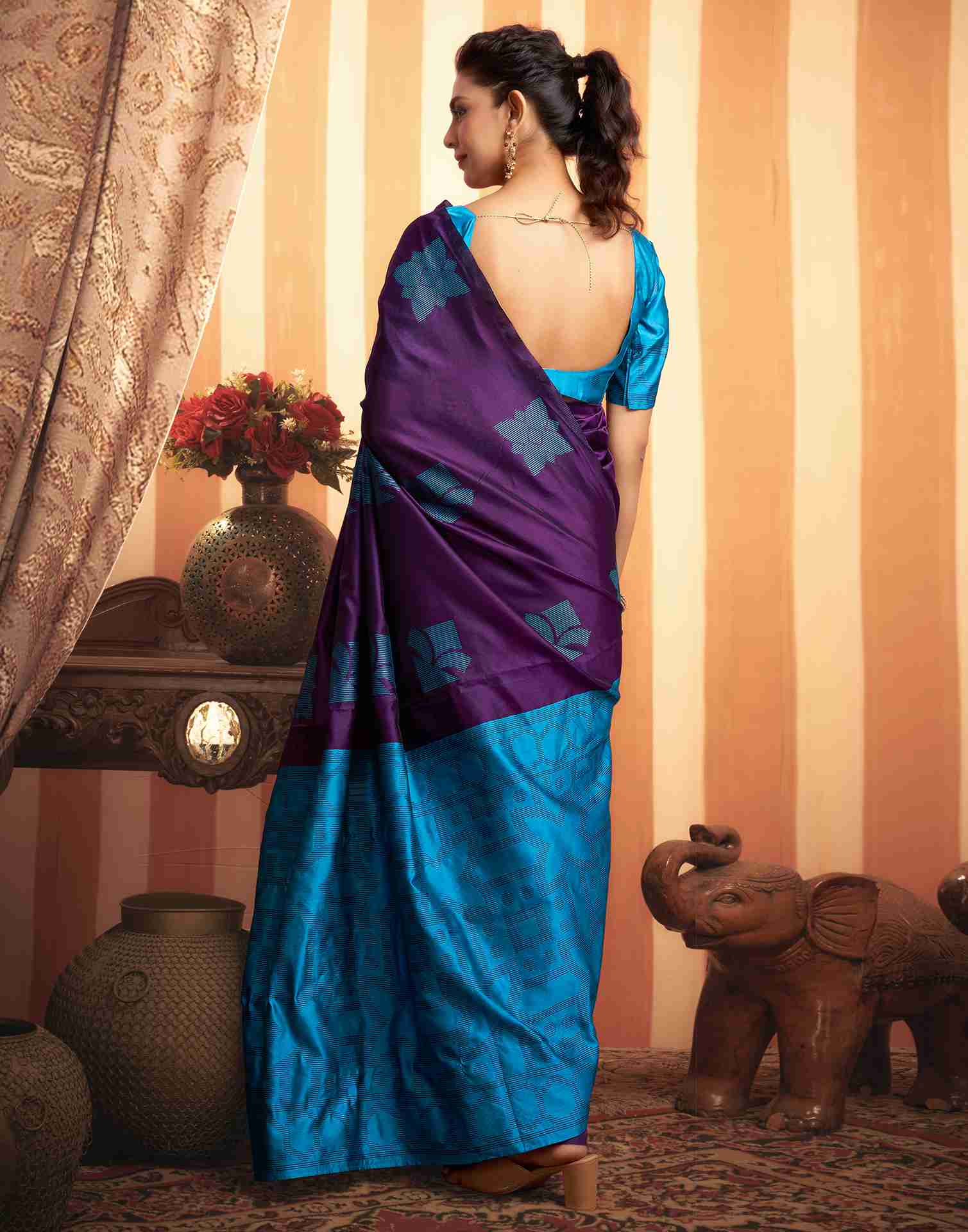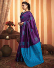 A perfect fusion of bold hues and heritage weaving, this saree ensures you stand out with poise and grandeur. The vibrant blue detailing adds a refreshing contrast to the royal purple base, making it a must-have for your festive wardrobe.