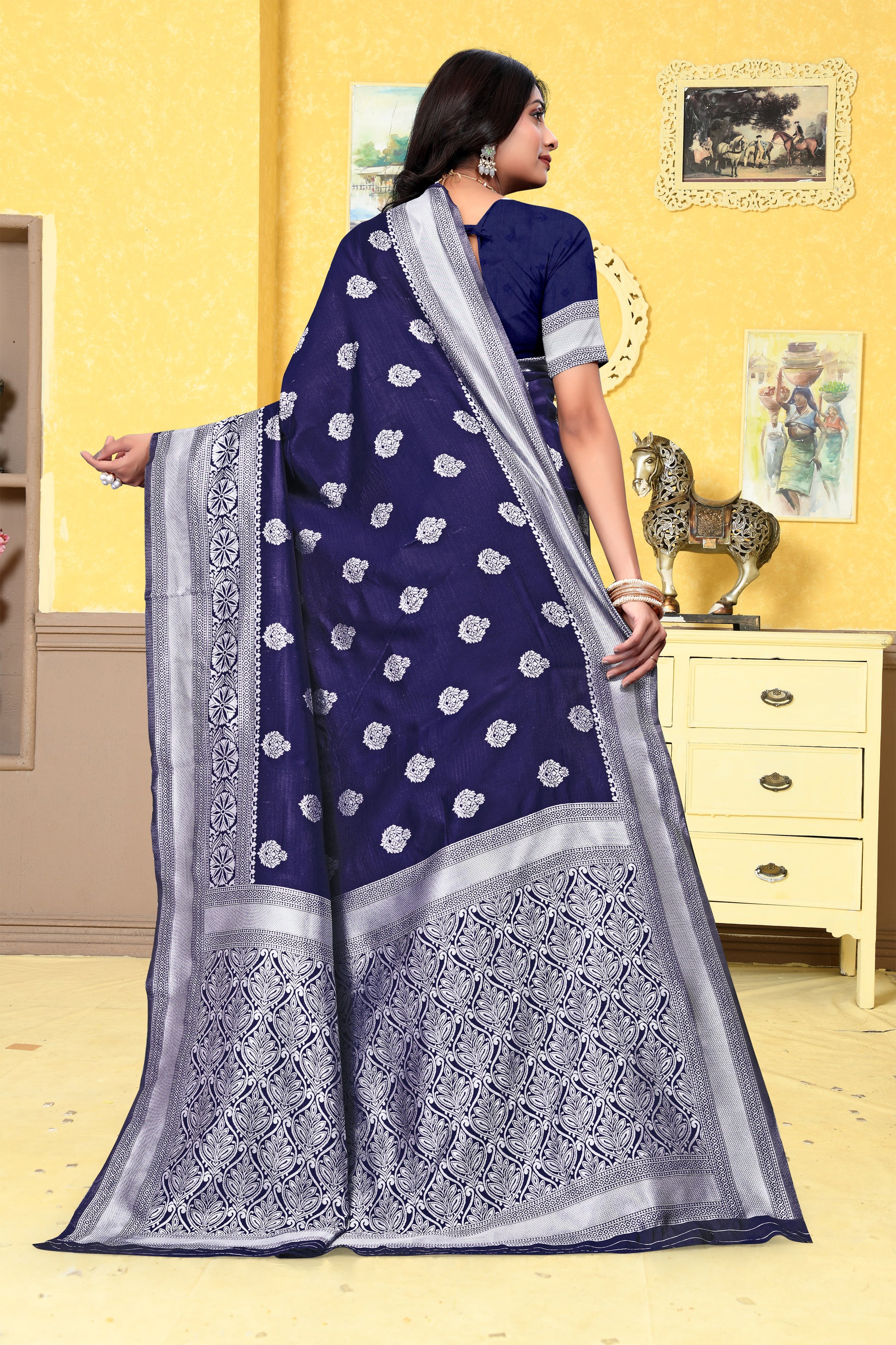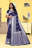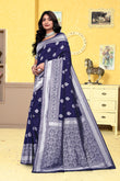 Majestically Navy Blue Banarasi Silk Saree with Intricate Silver Zari Weaving