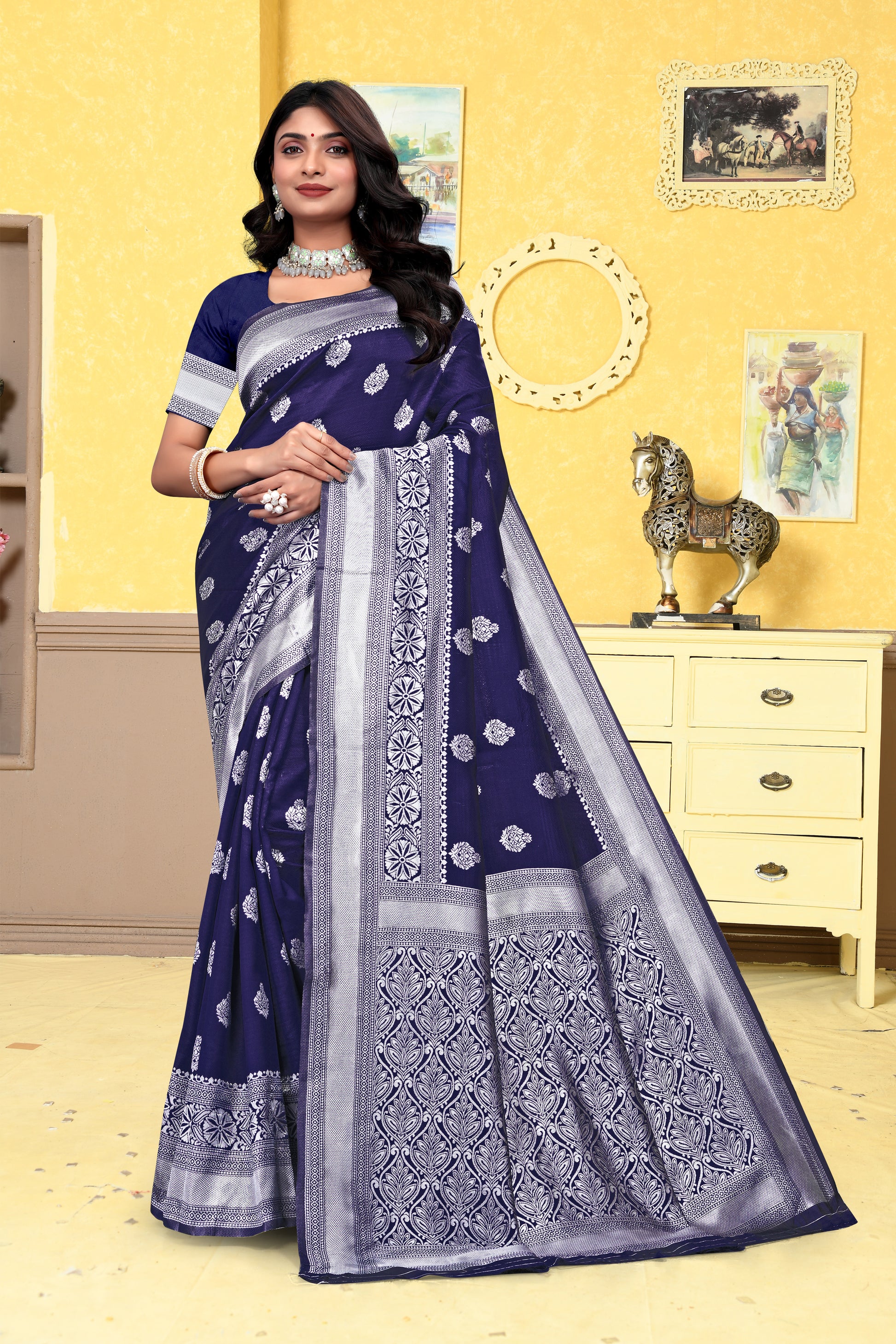 The striking combination of deep navy blue and shimmering silver zari makes this saree a unique and powerful statement piece. Its graceful drape and opulent design will ensure you stand out with unparalleled poise and sophistication at any event.