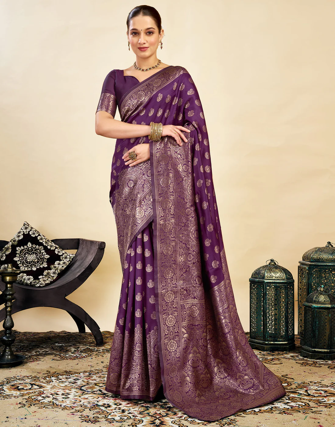 Design: Traditional golden zari tree-butta motifs with a rich border and pallu