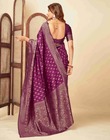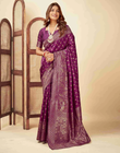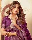 Blouse: Includes an unstitched, matching plum blouse piece with a zari border.