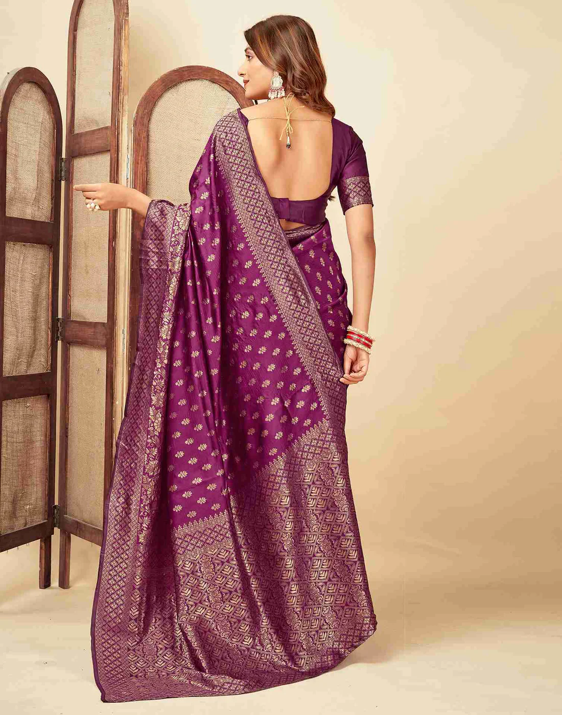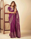 This saree is more than just an outfit; it's a testament to timeless beauty and artisanal skill. The luxurious plum color paired with the intricate golden zari work creates a captivating look that will make you feel confident and elegant. It's a statement piece that seamlessly blends traditional charm with a touch of modern grace, ensuring you stand out at any event.