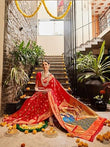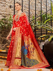 Radiant Red Banarasi Silk Saree with Hand-Painted Peacock Motif