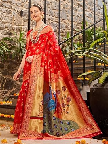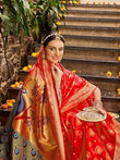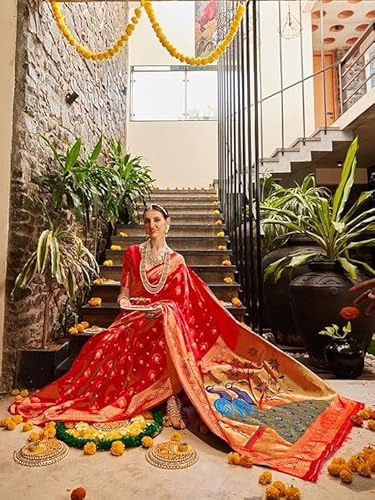 Color: Radiant Red with Golden Zari Weave and Hand-Painted Peacock
