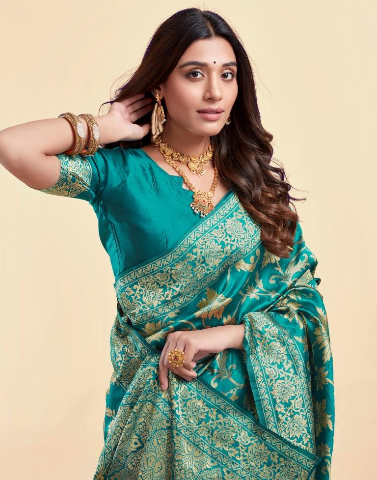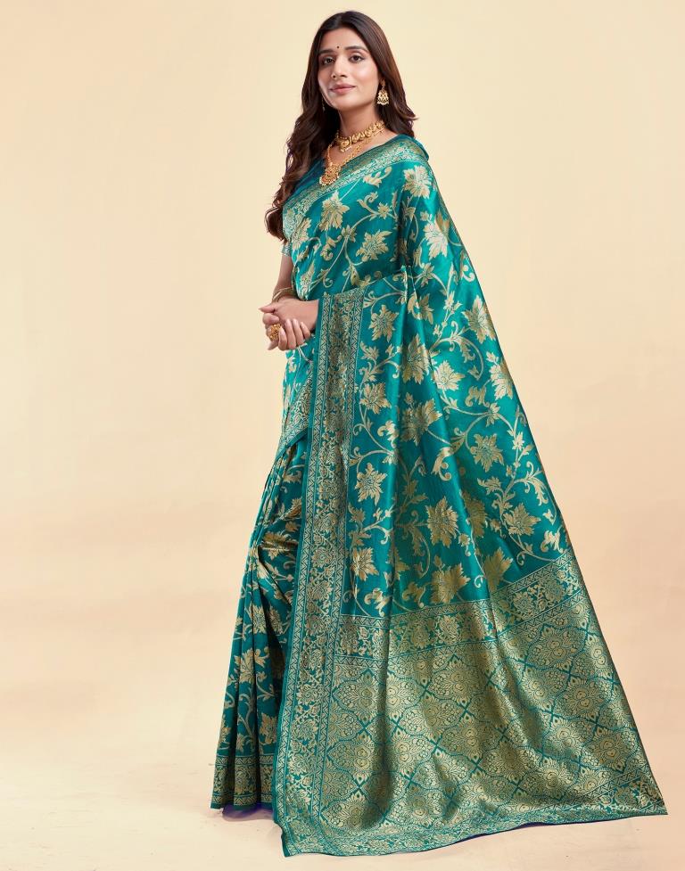 Refresh your ethnic collection with this exquisite Rama Green Banarasi Silk Saree. The unique shade, often described as a mix of teal and turquoise, creates a stunning backdrop for the intricate golden zari weaving. Traditional floral motifs and elaborate patterns flow gracefully across the fabric, finished with a grand, ornate border and pallu. This saree is a perfect choice for ☀️ daytime events, 💍 weddings, and 🪔 festive occasions, offering a look that is both traditional and effortlessly elegant.
