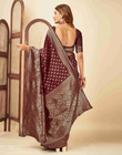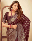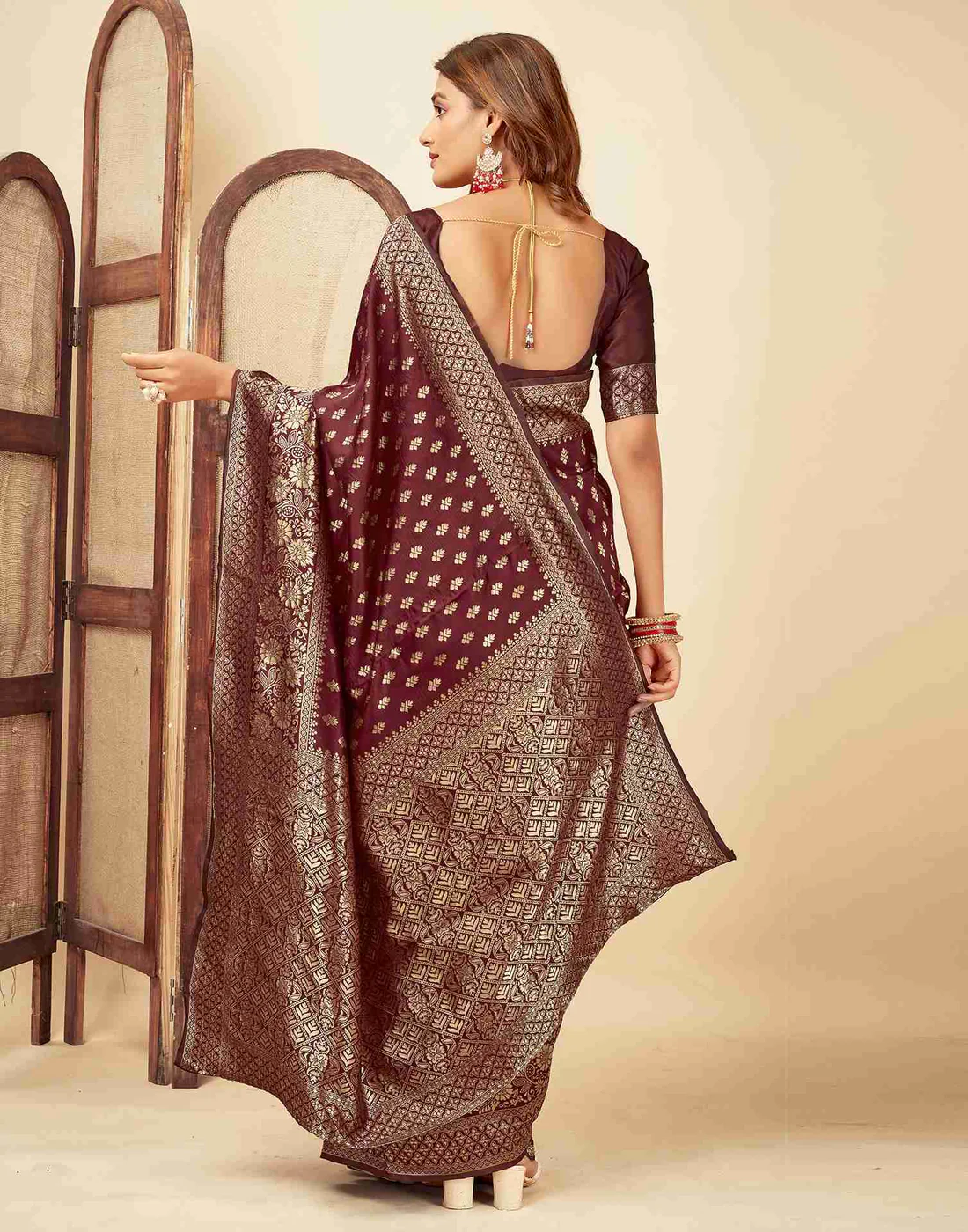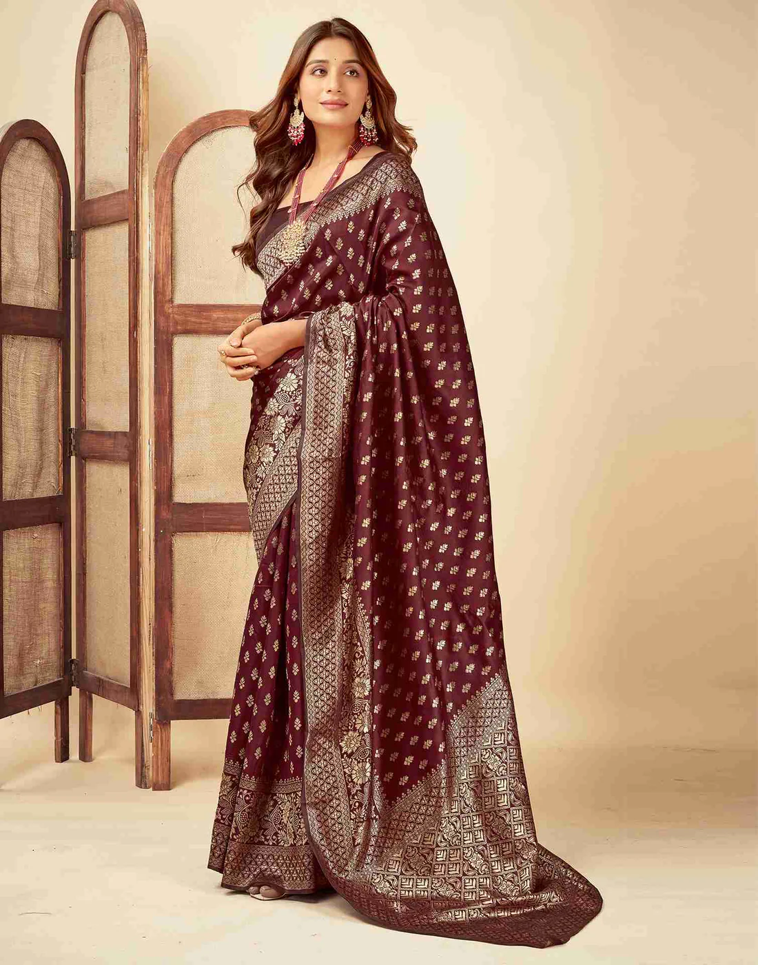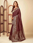 This saree is more than just an outfit; it's a testament to timeless beauty and artisanal skill. The luxurious maroon hue paired with the intricate golden zari work creates a captivating look that will make you feel confident and elegant. It's a statement piece that seamlessly blends traditional charm with a touch of modern grace, ensuring you stand out at any event.