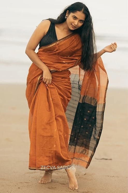 Step out in effortless style with this beautiful dual-tone cotton silk saree. The body of the saree features a rich rust orange hue, adorned with subtle motifs that add a touch of understated elegance. A striking contrast is created by the jet black pallu and border, which are detailed with delicate golden zari lines and scattered woven patterns. Lightweight and breathable, this saree is perfect for both a sophisticated look and all-day comfort, making it an ideal choice for office wear, casual gatherings, and small festive events.
