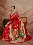 Scarlet Red Banarasi Silk Saree with Hand-Painted Parrot Motif