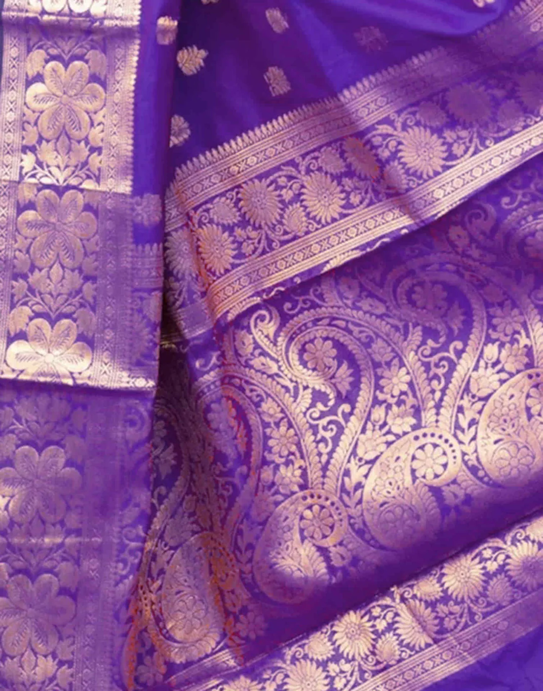Design: Traditional golden zari floral-paisley motifs with a grand border and pallu