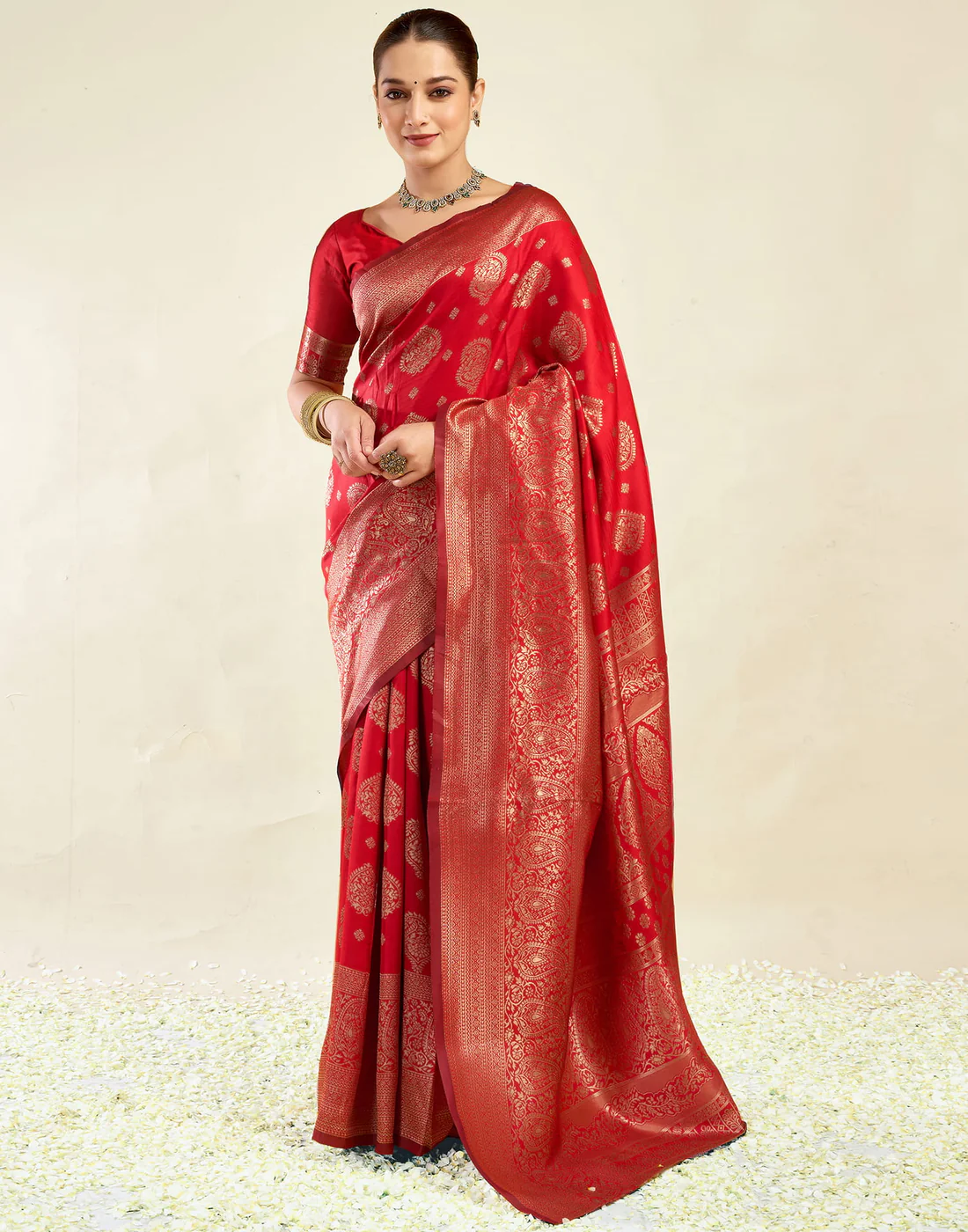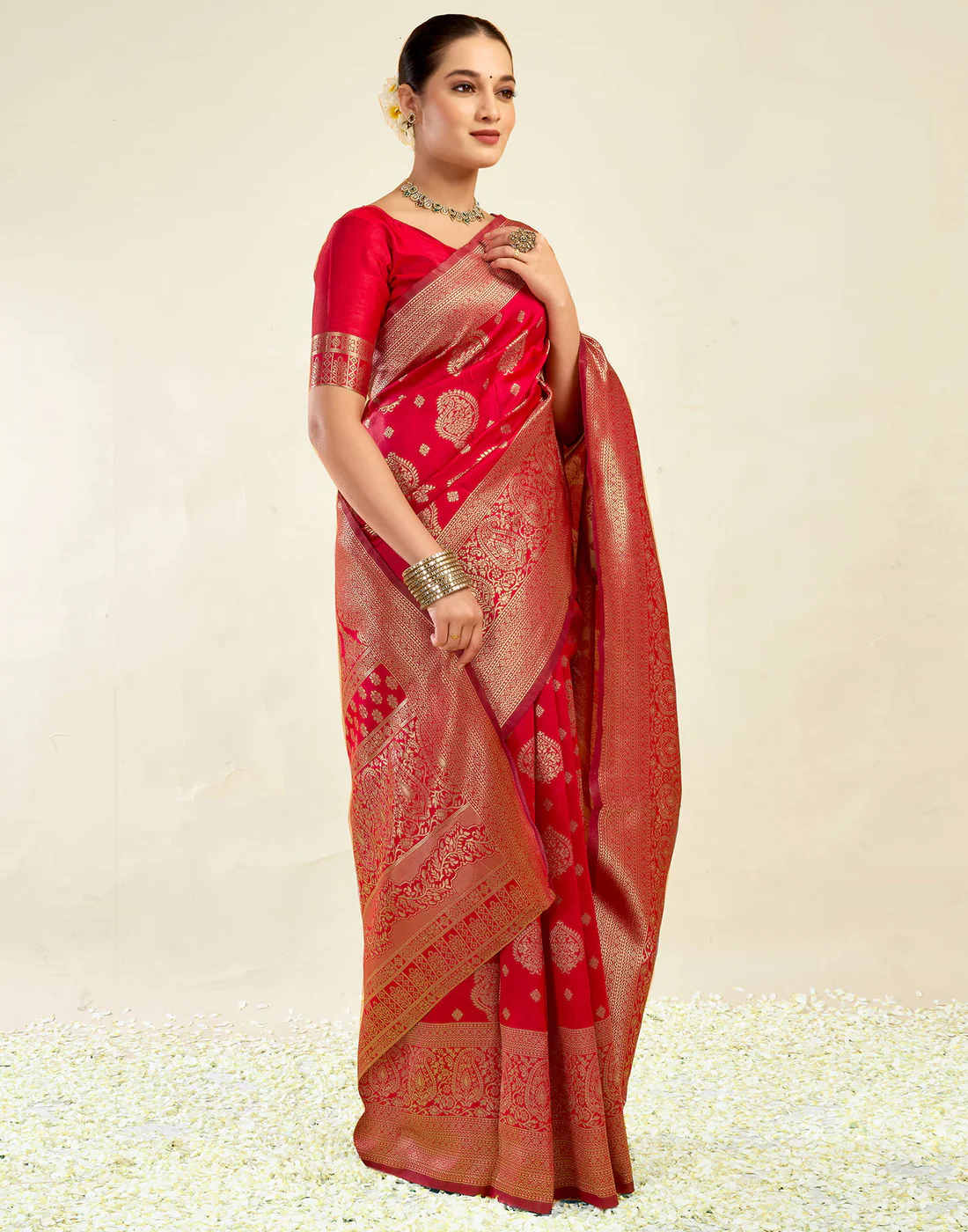 Stunning Red Banarasi Silk Saree with Luxurious Golden Zari Weaving