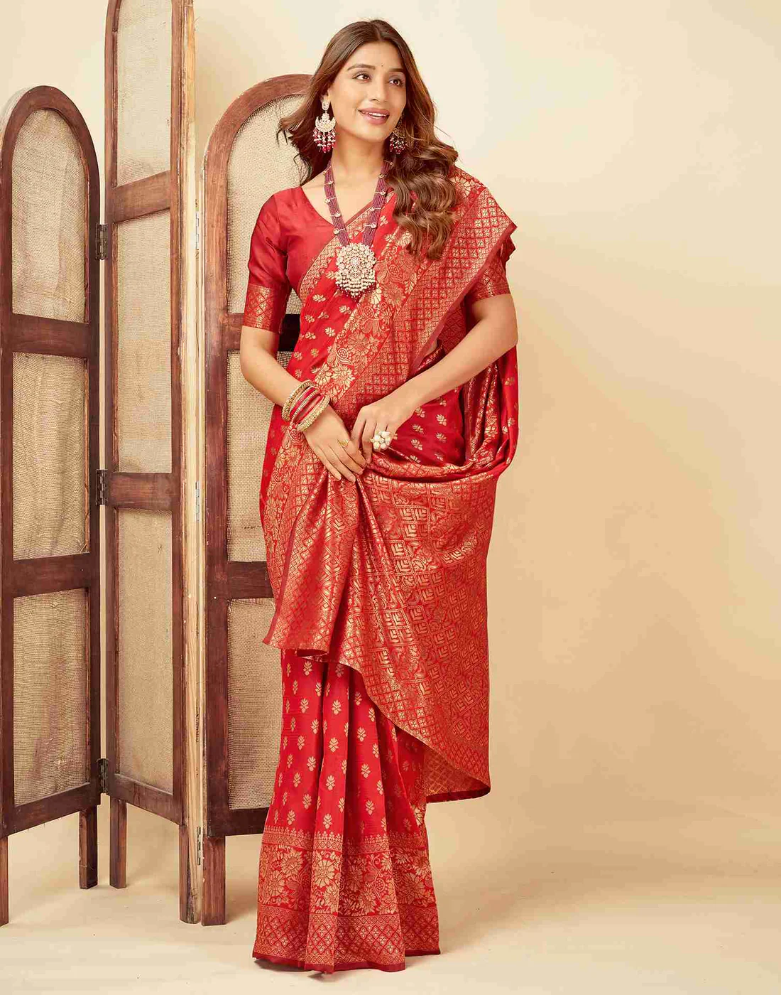 This saree is more than just an outfit; it's a testament to timeless beauty and artisanal skill. The luxurious red hue paired with the intricate golden zari work creates a captivating look that will make you feel confident and elegant. It's a statement piece that seamlessly blends traditional charm with a touch of modern grace, ensuring you stand out at any event.